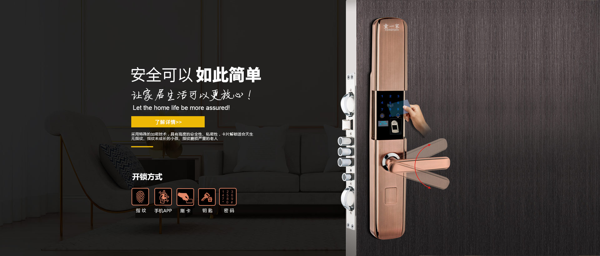 是一家专注于智能锁、智能门、防盗门、非标门研发和生产、安装、售后于一体的公司,专注于高端智能门锁、全自动智能锁、指纹锁、密码锁、大彩屏指纹锁研发。公司经过多年的发展,在广大客户的大力支持下,通过自身不断的创新和积累,童一家智能锁已经跻身国内品牌。